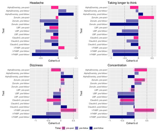 We found that both pre-post and pre-follow-up change in IP biomarker levels showed correlations with cumulative exposure with data available for 21 participants (Table S1). Exploratory investigations involving blast-related symptoms in association with measures of alpha-diversity and IP biomarkers were also performed. The examination of symptom data collected serially with blood collection sampling during the training showed an elevated reporting of symptoms (for those symptoms with more than 10 subjects reporting at post timepoints) related to headache, concentration, dizziness, and taking longer to think acutely following blast (Figure 4) that dissipated 16 h following. For each symptom, participants were assigned to either of two groups based on changes in their self-reported symptoms (i.e., increasing vs. non-increasing) by comparing the symptom scales reported at pre vs. post per subject. Then, the increasing vs. the non-increasing groups by symptom were compared for differences in alpha-diversity and levels of IP biomarkers (separately) across timepoints (specifically post-pre), with effect size measured by Cohen’s d (Figure 5, and Supplementary Table S2).