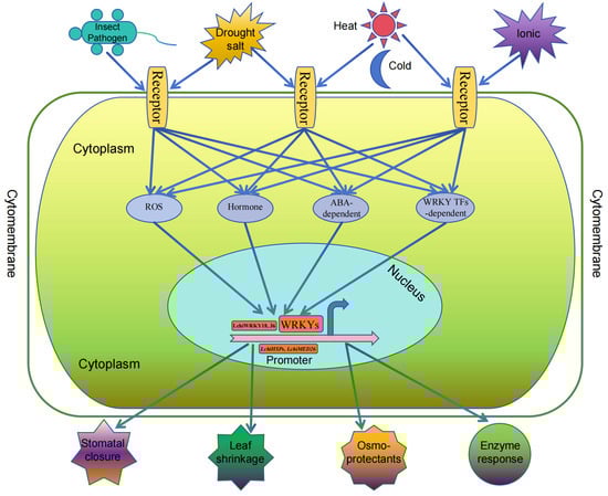 - Khoso, M.A.; Hussain, A.; Ritonga, F.N.; Ali, Q.; Channa, M.M.; Alshegaihi, R.M.; Meng, Q.; Ali, M.; Zaman, W.; Brohi, R.D.; et al. WRKY transcription factors (TFs): Molecular switches to regulate drought, temperature, and salinity stresses in plants. Front. Plant Sci. 2022, 13, 1039329. [Google Scholar] [CrossRef] [PubMed]