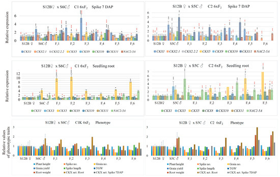 TaCKX GFM and NAC2 expression patterns in 7 DAP spikes, seedling roots, and phenotypic traits in mother, pater, and their six F2 progeny, from crosses of S12B × S6C (C1*) and S12B × S5C (C2). Data represent mean values with standard deviation and are related to mother set as 1.00. Black and red asterisks indicate statistical significance compared to maternal parent or paternal parent, respectively (* 0.05 > p ≥ 0.01, ** 0.01 > p ≥ 0.001, *** p < 0.001). Data for C1 cross were already presented in Szala et al. [24], where S12B was component of reciprocal cross.