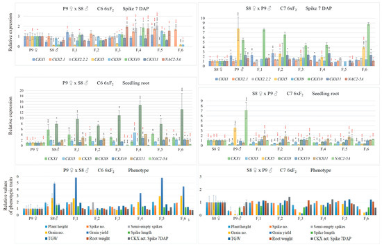 TaCKX GFM and NAC2 expression patterns in 7 DAP spikes, seedling roots, and phenotypic traits in mother, pater, and their six F2 progeny, from crosses of awned mother and awnless pater, P9 × S8 (C6), and awnless mother and awned pater, S8 × P9 (C7). Data represent mean values with standard deviation and are related to mother set as 1.00. Black and red asterisks indicate statistical significance compared to maternal parent or paternal parent, respectively (* 0.05 > p ≥ 0.01, ** 0.01 > p ≥ 0.001, *** p < 0.001).
