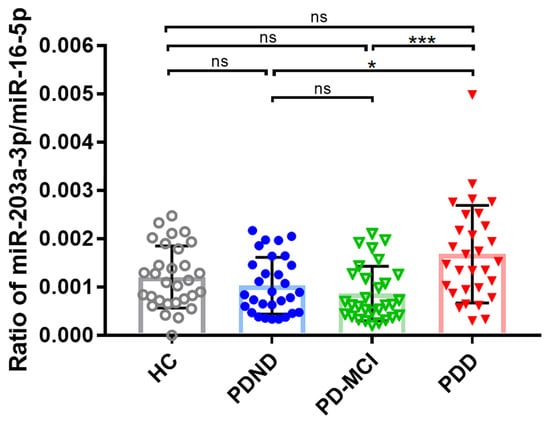 The ddPCR examination of miR-203a-3p/miR-16-5p. The ratio of miR-203a-3p/miR-16-5p of all samples in the validation cohort was analyzed using the Kruskal–Wallis test followed by Dunn’s multiple comparisons test (post hoc test) among the study groups. * p-value < 0.05; *** p-value < 0.001; ns, no significant difference. HC (n = 30), PDND (n = 30), PD-MCI (n = 30), and PDD (n = 30). Data are shown as the mean ± SD. HC, healthy control; PDND, Parkinson’s disease with no dementia; PD-MCI, Parkinson’s disease with mild cognitive impairment; PDD, Parkinson’s disease with dementia.