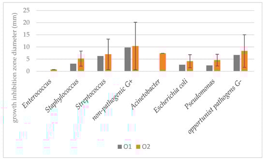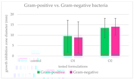 p < 0.05). In the case of O1, the mean growth inhibition of Gram-positives was 9.5 mm, whereas the one of Gram-negatives was 8.9 mm. In the case of O2, it was 13.4 and 14.04 mm for Gram-positives and Gram-negatives, respectively.