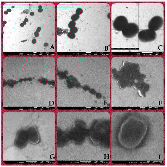 Figure 5D–I) reveal evident differences in the bacterial structures, indicating effective cell wall rupture that caused increased permeability and, finally, leakage of the cell matrix.