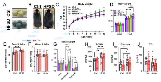 To investigate the anti-obesity effects of T3s, the body weight of all mice was measured once per week. The body weight of all mice gradually increased during the feeding of each experimental diet (Figure 1C). While the body weight of HFSD-fed mice was significantly higher than that of the control diet (Ctrl)-fed mice, no significant differences were found between the body weight of HFSD-fed mice and that of HFSD + T3s-fed mice (Figure 1D). In both Ctrl and HFSD mice, no significant differences were found in calorie and water intake in the presence or absence of T3s (Figure 1E,F). Similarly, the epididymal and perirenal fat weight of both HFSD− and HFSD + T3s-fed mice were significantly greater than that of control mice (Figure 1G). Total cholesterol (T-CHO) and glucose levels were significantly elevated by feeding with HFSD and HFSD + T3s, respectively (Figure 1H,I). On the other hand, the concentration of Triglyceride (TG) was not altered by HFSD and/or T3s (Figure 1J).