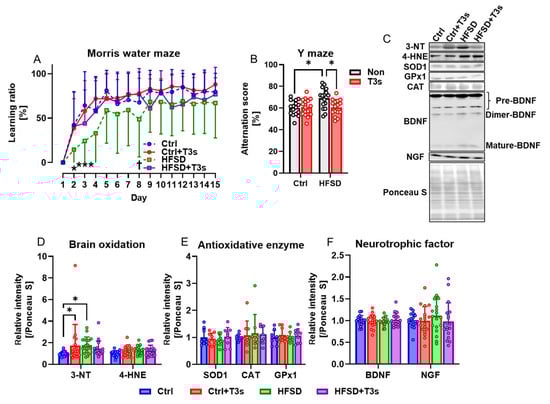 Based on the free radical theory of aging, the level of brain oxidation was measured by Western blotting (Figure 2C,D). The results showed that protein oxidation was accelerated by HFSD feeding, and no significant difference was found between Ctrl + T3s and HFSD + T3s. However, there were no significant differences in antioxidant enzyme expression (Figure 2E). The expression of neurotrophic factors, which play a significant role in cognition, was also assessed using Western blotting. The relative expression level of NGF tended to (not significant) be higher in the brain of HFSD-fed mice than Ctrl mice (Figure 2F).