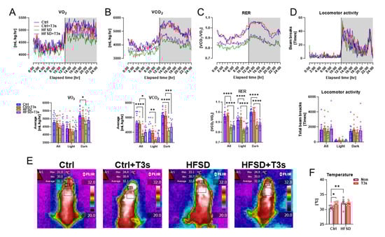 Feeding of HFSD alters respiratory metabolism and temperature near the scapula. (A–D) Indices of respiratory metabolism ((A), oxygen consumption; (B), carbon dioxide production; (C), volume ratio of VO2 and VCO2; (D), locomotion). The upper graphs show the changes for 24 h (white background during light; gray background during dark). The lower graphs show the average or total value for 24 h and light or dark period (* p < 0.05, ** p < 0.01, *** p < 0.001, **** p < 0.0001, all experimental groups and all parameters; n = 15). (E) Representative infrared images. (F) Quantification of the temperature around the scapula (* p < 0.05, ** p < 0.01, all experimental groups; n = 9). All data are shown as the mean ± SD.