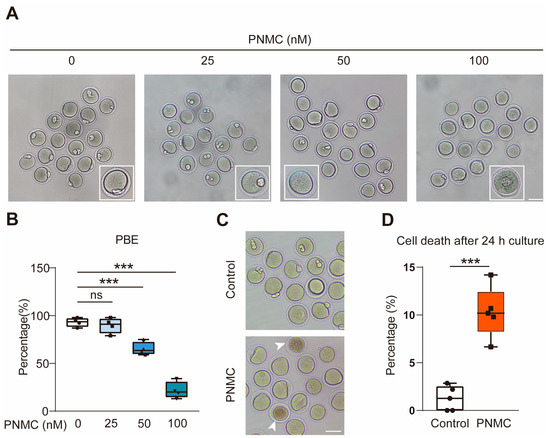 PNMC exposure disturbs the meiotic maturation of oocytes. (A) Fully grown GV oocytes were exposed to PNMC at the indicated concentrations (0, 25, 50, and 100 nM) for 14 h. Control and 25 nM PNMC-treated groups normally attained meiotic maturation; however, most oocytes failed to accomplish PBE after treatment with 50 and 100 nM PNMC. Scale Bar = 100 µm. (B) The percentages of PBE in control (n = 206) and PNMC-exposed groups (25 nM, n = 255; 50 nM, n = 281; 100 nM, n = 196) are shown. (C) The oocytes were cultured for 24 h to investigate the effects of PNMC exposure on oocyte mortality. Cell death was prominent in the 50 nM PNMC-exposed oocytes, unlike in the control group. Scale Bar = 100 µm. (D) The proportion of cell death was analyzed in control (n = 195) and 50 nM PNMC-exposed (n = 188) oocytes. ns (not significant) means p ≥ 0.05; *** p < 0.001.