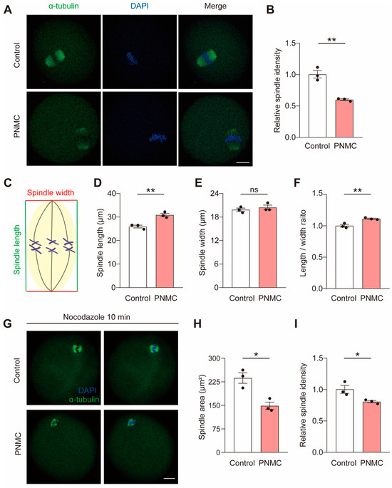 Given the spindle defects after PNMC exposure, we used nocodazole, a reversible microtubule depolymerized agent, to confirm the effects of PNMC on spindle stability. After 10 min of nocodazole depolymerization, the area of spindle microtubules in MI-stage oocytes in the PNMC-exposed group was significantly smaller than in controls (237.20 ± 23.75 µm2 vs. 148.71 ± 16.65 µm2; p < 0.05; Figure 2G,H), along with reduced fluorescence intensity (Figure 2I). Therefore, 50 nM PNMC treatment disrupted spindle stability but not the chromosomal alignment.