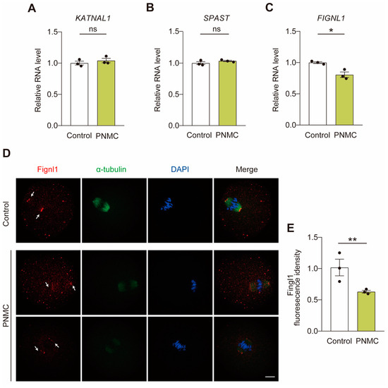 Ablation of microtubule-severing proteins (MTSPs) induces defects in the spindle apparatus in oocytes, consistent with the aberrant phenotype observed after PNMC exposure. Therefore, the effect of PNMC treatment on the expression of MTSP marker genes (SPAST, KATNAL1, and FIGNL1) was evaluated by qRT-PCR. The mRNA levels of SPAST and KATNAL1 exhibited no significant difference in the MI stage between control and PNMC-exposed groups (Figure 3A,B); however, the mRNA levels of FIGNL1 were significantly lower after PNMC exposure (Figure 3C).