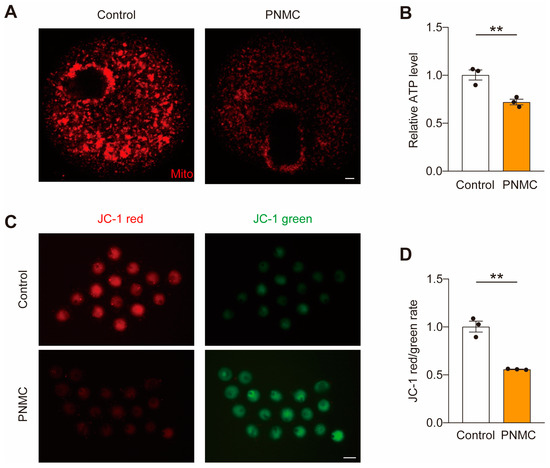 Given the crosstalk between spindle and mitochondria, we examined if the mitochondrial function was impaired after PNMC exposure. Mitochondrial accumulation at both cytoplasm and spindle peripheries decreased in most PNMC-exposed oocytes (Figure 4A), indicating that PNMC disrupted the mitochondrial distribution during oocyte maturation. Next, we examined ATP production. ATP levels in the PNMC-exposed oocytes were significantly lower than those in the control oocytes (Figure 4B). Consistently, the mitochondrial membrane potential (MMP), which drives ATP synthesis, was significantly reduced in PNMC-treated oocytes (Figure 4C,D). Therefore, PNMC exposure impaired mitochondrial function, including mitochondria distribution, ATP production, and MMP.
