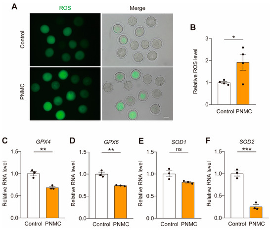 Mitochondria are the center of oxidative metabolism and the principal site of reactive oxygen species (ROS) production. ROS levels increased if mitochondrial dynamics and function were disrupted. The ROS levels increased in the PNMC-exposed groups (Figure 5A,B). Consistent with the elevated ROS levels, decreased expression of antioxidant genes (GPX4, GPX6 and SOD2) was confirmed in the PNMC-exposed oocytes (Figure 5C–F). So, PNMC exposure leads to the accumulation of ROS.