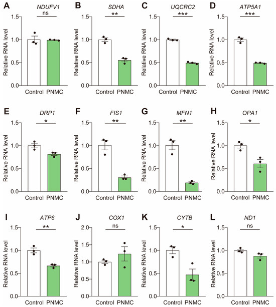 Given mitochondrial dysfunction upon exposure to PNMC, we examined the expression levels of mitochondria-related genes. First, we determined the mRNA levels of the mitochondrial respiratory complexes. As shown in Figure 6A–D, the transcriptional profiles of SDHA (Complex II), UQCRC2 (Complex III), and ATP5A1 (Complex V) were significantly decreased, explaining the reduced ATP levels in PNMC-exposed oocytes. We assessed the transcriptional profiles of mitochondria fission genes, FIS1 and DRP1, and fusion genes, MFN1 and OPA1. The mRNA levels of these genes were all significantly diminished (Figure 6E–H). The aberrant mitochondrial dynamic (fission and fusion) may have been partially caused by the defective mitochondrial distribution in PNMC oocytes. PNMC exposure significantly downregulated the mRNA levels of mitochondrial DNA (mtDNA), ATP6 and CYTB (Figure 6I–L). Taken together, PNMC may directly target the mitochondria.