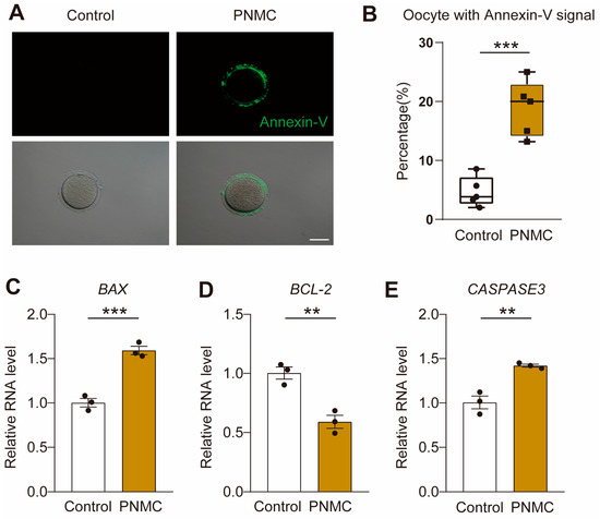 Owing to the aberrant mitochondrial function following PNMC exposure, we speculated that the apoptotic level of oocytes may also be elevated. Therefore, we performed Annexin-V-FITC staining analysis to examine the apoptosis level. In the control groups, there were almost no apoptotic oocytes. However, the number of Annexin-V-positive oocytes increased significantly in the PNMC-exposed group (p < 0.05; Figure 7A,B). The mRNA levels of the apoptotic genes, BAX and CASPASE3, were significantly up-regulated. The mRNA level of the anti-apoptotic gene, BCL-2, was remarkably down-regulated in the PNMC-exposed oocytes (Figure 7C–E). We inferred that PNMC treatment triggered early apoptosis in mouse oocytes.