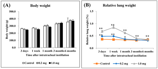 Body weight and relative lung weight after instillation. (A) Time course of changes in the body weights of rats in each group. (B) Relative weight of the whole lung was calculated as a ratio of whole lung weight (g) to body weight (g) for each rat. The relative lung weight exhibited a dose-dependent increase from 3 days to 3 months. All data are presented as mean ± SE (* p < 0.05, ** p < 0.01) (Table A1).