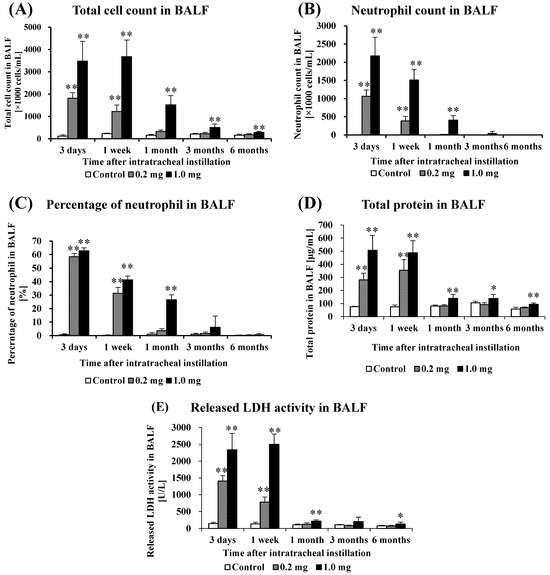 Analysis of cell number, total protein and released LDH activity in BALF following intratracheal instillation. (A) Total cell count in BALF, (B) Neutrophil count in BALF, (C) Percentage of neutrophil in BALF, (D) Total protein in BALF, (E) Released LDH activity in BALF. All data are presented as mean ± SE (* p < 0.05, ** p < 0.01) (Table A2).