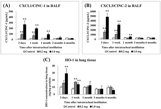 Analysis of chemokines in bronchoalveolar lavage fluid (BALF) and HO-1 in lung tissue following intratracheal instillation. (A) CXCL1/CINC-1 in BALF, (B) CXCL3/CINC-2 in BALF, (C) HO-1 in lung tissue. All data are presented as mean ± SE (* p < 0.05, ** p < 0.01) (Table A3).