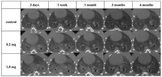 For three out of the five animals in each experimental group, a 3D micro-CT scan was conducted hours to days prior to dissection at each designated observation time. The X-ray 3D micro-CT system used for this purpose was the CosmoScan GX, manufactured by Rigaku Co., Tokyo, Japan. The system was operated under specific conditions, including a scanning time of 4.0 min, an average whole-body exposure of 161.9 mGy per scan, a tube voltage of 90 kV, a tube current of 88 µA and a chest CT with a field of view (FOV) measuring 60 mm × 40 mm (voxel matrix: 512 µm × 512 µm × 512 µm; voxel size: 120 µm × 120 µm × 120 µm). The rats were positioned in the prone posture during the scanning process, and sevoflurane (supplied by Pfizer Japan, Tokyo, Japan) and oxygen were administered through a nose cone. The acquired images were retrospectively gated at both respiratory phases, encompassing both inspiration and expiration.