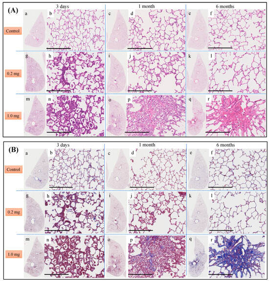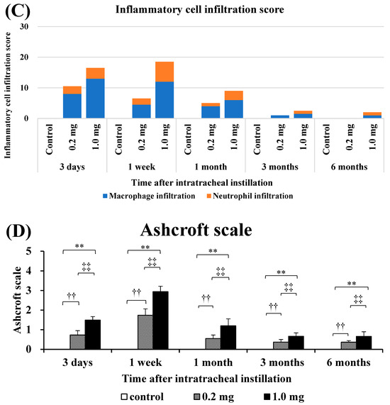 Histological findings after intratracheal instillation (hematoxylin and eosin (HE) and Masson’s trichrome (MT) staining). (A) Histological findings with HE staining at 3 days, 1 month and 6 months after intratracheal injection. (B) Histological findings with MT staining at 3 days, 1 month and 6 months after intratracheal injection. (a–f) One of the specimens from the group given distilled water as a control. (g–l) One of the specimens from the group receiving 0.2 mg of polyacrylic acid (PAA) as the low dose. (m–r) One of the specimens from the group receiving 1.0 mg of PAA as the high dose. The scale of the black bar is 250 μm. (C) Inflammatory scale at each time. (D) Ashcroft scale at each time is presented as mean ± SE (** p < 0.01, and ‡‡ p < 0.01, †† p < 0.01) (Table A4).