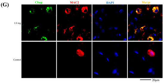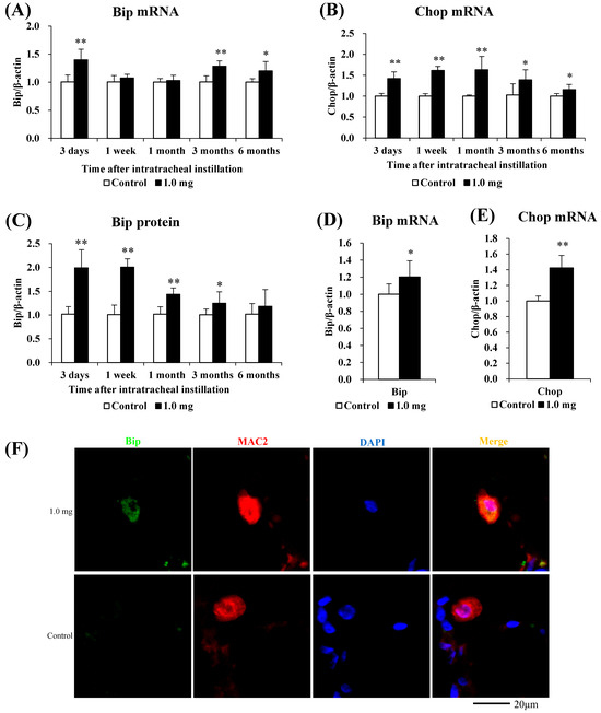 Evaluation of the relationship between PAA and ER stress. (A) Bip mRNA, (B) Chop mRNA in lung tissue. (C) Bip protein in lung tissue using Western blotting. (D) Bip mRNA, (E) Chop mRNA in cells in BALF. All data are presented as mean ± SE (* p < 0.05, ** p < 0.01) (Table A5). Unpaired t-test was used to appropriately detect differences among the exposed groups. (F) Co-localization of Bip and macrophages in fluorescent immunostaining. (G) Co-localization of Chop and macrophages in fluorescent immunostaining.