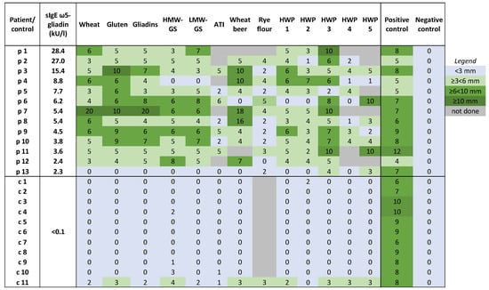 Skin prick tests (SPTs) were performed as prick-to-prick tests using the following substances: native wheat flour (type 550); wheat gluten; rye flour (all commercially available); wheat beer (Paulaner Brauerei, Munich, Germany); five hydrolyzed wheat proteins (HWPs 1–5), which different manufacturers kindly provided; isolated LMW-GS, HMW-GS, and gliadins (produced as previously described []); and α-amylase/trypsin inhibitors (ATI; Merck KGaA, Darmstadt, Germany; 5–10 mg/mL dilution in isotonic saline solution). Histamine dihydrochloride (10 mg/mL; ALK-Abello, Copenhagen, Denmark) was used as the positive control solution, and 0.9% saline was used as the negative control, respectively. Results with a mean wheal diameter of 3 mm or greater compared with the negative control after 20 min were considered positive.