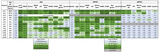 The aBHRA has previously been used in very early studies to investigate the reactivity of WALDA patients to ω5-gliadin and gluten [,] and to characterize the sensitization profile in a special cohort of ω5-gliadin-negative WALDA patients sensitized by hydrolyzed wheat proteins (HWPs) in Japan [,]. However, to our knowledge, this test has not been used to study sensitization profiles beyond gluten and ω5-gliadin for patients with conventional, ω5-gliadin-positive WALDA, nor has it been used in combination with the BAT and pBHRA.