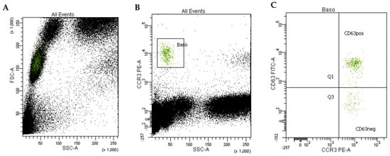 BAT measurement of a WALDA patient (patient 4) with alcohol-free wheat beer in a dilution of 1:100: (A) The cells were gated based on their granularity and size using side scatter (SSC-A) and forward scatter (FSC-A). (B) Basophil identification was performed using side scatter and the CCR3 identification marker, labeled with an anti-CCR3-phycoerythrin monoclonal antibody. (C) The quantification of CD63-positive cells within the total basophil population was performed using CD63 as the basophil activation marker, labeled with anti-CD63-fluorescein-isothiocyanate monoclonal antibodies; in this patient, 81% of 502 counted basophils were CD63+ upon stimulation with alcohol-free wheat beer (dilution 1:100).