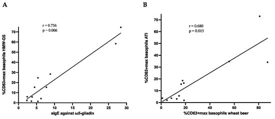 (A) Correlation between sIgE against ω5-gliadin and the basophil activation expressed as the maximum %CD63+ basophils with HMW-GS (high-molecular-weight glutenin subunits) allergen test solution in the BAT; (B) correlation between the basophil activation (expressed as maximum %CD63+ basophils) induced by ATIs (α-amylase/trypsin inhibitors) and alcohol-free wheat beer in the basophil activation test.