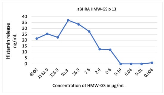 Histamine release (ng/mL) in the aBHRA with HMW-GS (high-molecular-weight glutenin subunits) test solution in different concentrations (in µg/mL) in a patient with WALDA (patient 13).