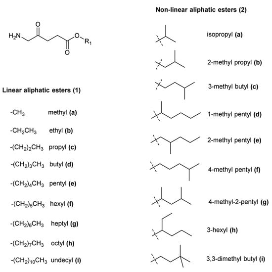 - Sajjad, F.; Sun, N.-N.; Chen, T.; Yan, Y.-J.; Margetić, D.; Chen, Z.-L. Evaluation of antimicrobial photodynamic activities of 5-aminolevulinic acid derivatives. Photodermatol. Photoimmunol. Photomed. 2021, 37, 296–305. [Google Scholar] [CrossRef]