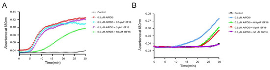16F16 inhibits the activity of AtPDI in vitro. Reductase activity assay for AtPDIs were performed by incubating 130 μM insulin, 0.5 μM AtPDI5 or AtPDI9, and varying concentrations of 16F16 (0.5 μM, 5 μM, and 50 μM), at 25 °C in 100 mM K-Pi buffer. The aggregation signal of the B chains was detected through light absorption at 650 nm, and this signal was used to characterize the reduction of insulin by AtPDI and its associated proteins. (A) The reductase activity of AtPDI5 was determined under different concentrations of 16F16 treatment. (B) The reductase activity of AtPDI9 was determined under different concentrations of 16F16 treatment. The experiment was performed in triplicate and data are expressed as mean ± SEM.