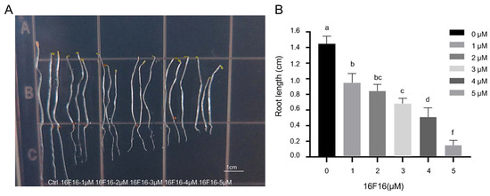Arabidopsis ecotype Columbia (Col-0) seed were used in this study. The Arabidopsis seeds were first vernalized at 4 °C for 2 days. Then, they were sterilized by surface treating with 75% alcohol three times for 1 min each, followed by sterilization with 20% sodium hypochlorite for 7–8 min. After that, the seeds were washed five times with sterile distilled water and sown in 1/2MS medium containing 16F16. Culture dishes containing seeds were placed vertically and treated in the dark for 6 days. After the 6-day period, the phenotype was photographed, and the changes in root length for each group were recorded and compared.