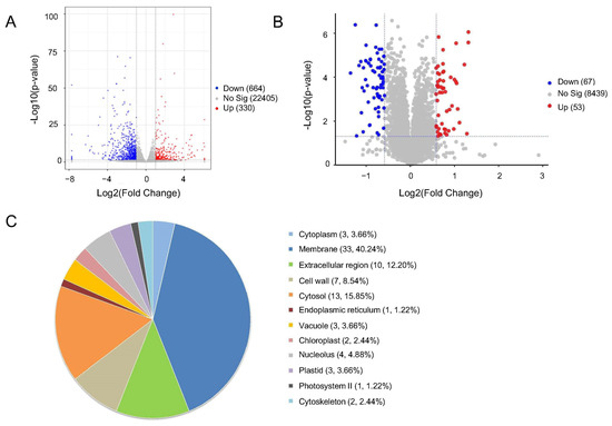 Analysis of DEGs and DEPs and subcellular localization of DEPs. (A) Volcano map of DEGs. Volcano plot of the number of DEGs identified by transcriptome analysis compared to WT. Each dot represents a gene. X-axis indicates log2 (Fold change) of DEGs and y-axis indicates −log10 (p-value). Red dots indicate up-regulated genes in the group, blue dots indicate down-regulated genes in the group, and gray dots indicate non-significant differentially expressed genes. (B) Volcano map of DEPs. Horizontal coordinates are log2 (Fold Change) and vertical coordinates are −log10 (p-value). Red dots signify up-regulated expressed proteins, blue dots indicate down-regulated expressed proteins, and gray dots represent non-significantly differentially expressed proteins within the group. (C) Subcellular localization prediction of the differentially expressed proteins.