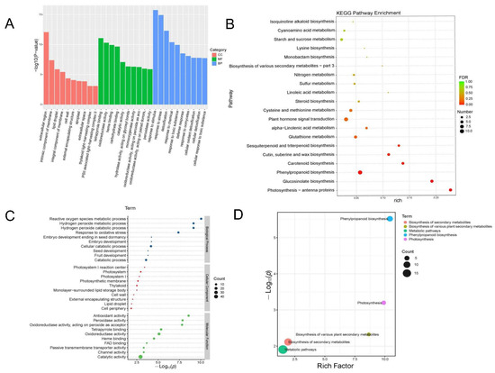 For proteome sequencing, the top 10 term of DEPs enrichment significance in BP, MF and CC branches were selected. In BP, DEPs are mainly involved in “reactive oxygen species metabolic process”, “hydrogen peroxide metabolic process”, “hydrogen peroxide catabolic process”, “response to oxidative stress” and “embryo development”. In CC, DEPs are mainly enriched in the “photosystem I reaction center”, “photosystem”, “photosystem I”, “photosynthetic membrane” and “thylakoid”. In MF, DEPs are mainly associated with “antioxidant activity”, “peroxidase activity”, “oxidoreductase activity, acting on peroxide as acceptor”, “tetrapyrrole binding” and “oxidoreductase activity” (Figure 5C).