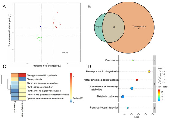 To reveal the correlations between DEGs and DEPs, we performed a combined analysis of the transcriptome and proteome. A total of 16 shared DEGs were detected. Fifteen DEGs showed the same expression trend, and one DEG showed an opposite expression trend. The genes detected in the proteome and transcriptome were divided into nine modules based on their expression patterns, and represented in a nine quadrant diagram (Figure 6A). In order to further investigate the biological pathways in which DEGs and DEPs play a role, a KEGG enrichment analysis was performed. The results of the combined analysis showed that DEGs and DEPs were co-enriched in 17 common pathways (Figure 6B), and were significantly enriched in the pathways of “phenylpropanoid biosynthesis”, “photosynthesis”, “starch and sucrose metabolism”, “plant−pathogen interaction”, “plant hormone signal transduction”, “pentose and glucuronate interconversions”, and “cysteine and methionine metabolism” (Figure 6C). DEGs and DEPs with the same expression trend were significantly enriched in six pathways: “phenylpropanoid biosynthesis”, “alpha−Linolenic acid metabolism”, “peroxisome”, “biosynthesis of secondary metabolites”, “plant−pathogen interaction” and “metabolic pathway”. KEGG enrichment analysis showed that the phenylpropanoid biosynthetic pathway was highly enriched by DEGs and DEPs, again demonstrating that the phenylpropanoid biosynthetic pathway is an important pathway affecting the root development of Arabidopsis seedlings under 16F16 treatment (Figure 6D).
