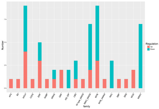 A significant number of transcription factors were activated following treatment with 16F16. Analysis of transcriptome data revealed 59 differentially expressed transcription factors, with basic helix–loop–helix (bHLH), MYB, MIKC_MADS, WRKY, and ERF being the most prominent. Among these, bHLH and MYB-type transcription factors exhibited the highest number of activated members, with nine each. MIKC_MADS, WRKY, ERF, NAC, LBD, GRAS, WOX, GRF, HD-ZIP-type transcription factors have 2–7 activated members. We focused on four transcription factors, including bHLH, MYB, MIKC_MADS, WRKY. For the bHLH group, there were four up-regulated and five down-regulated DEGs. For the MYB group, there were three up-regulated and six down-regulated DEGs. Similarly, the MIKC_MADS group had more down-regulated than up-regulated DEGs (Figure 7). And all seven DEGs in the WRKY group found to be down-regulated, suggesting a potential negative correlation with the expression of genes related to root development. The precise mechanism by which these transcription factors regulate genes related to root development remains unclear and requires additional validation.