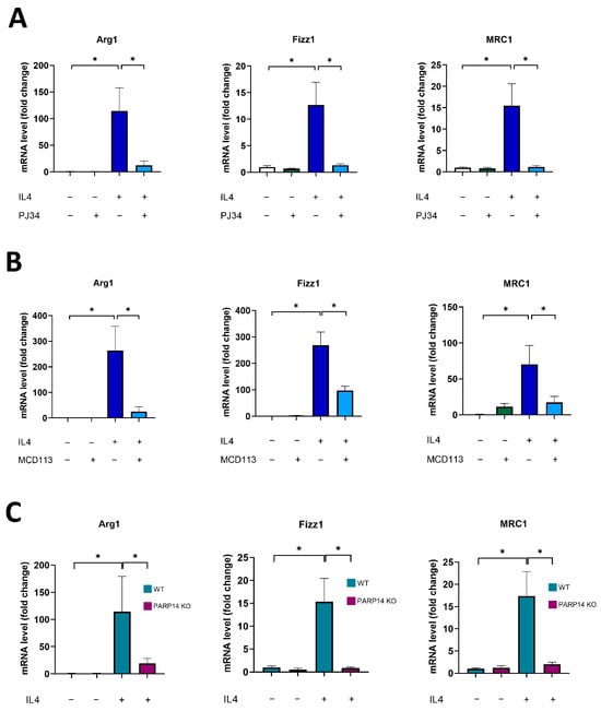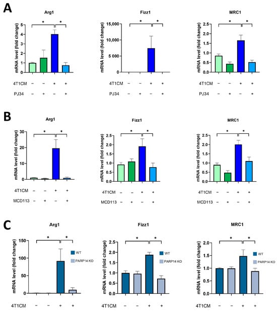 To investigate the role of PARP14 in TAM polarization, we set up an in vitro model in which the supernatant (or conditioned media, CM) was transferred from cancer cell lines to MΦs. BMDMs were differentiated from C57/BL6 mice with M-CSF for 6 days, as described in Section 4, and then cultured with conditioned media collected from the 4T1 mouse mammary carcinoma cells and diluted at a 1:1 ratio with complete DMEM medium [,] for 24 h. We observed that the conditioned media (CM) of 4T1 cells (4T1CM) induced M2-like polarization in BMDMs as indicated by M2 marker (Arg1, Fizz1, and MRC1) expression (Figure 2). To assess the role of PARylation in the polarization of TAMs, we used the PARPi PJ34 and the PARP14i MCD113 in this model. Interestingly, we found that both inhibitors significantly reduced the expression of the M2 markers, suggesting that ADP-ribosylation via PARP14 contributes to the induction of the TAM phenotype (Figure 2A,B). The absence of PARP14 in BMDMs isolated from PARP14−/− mice also resulted in suppression of the 4T1CM-induced TAM phenotype (Figure 2C). Taken together, these data demonstrate that 4T1CM triggers an M2-like polarization of murine BMDMs and suggest that PARP14 is a key mediator of TAM polarization.