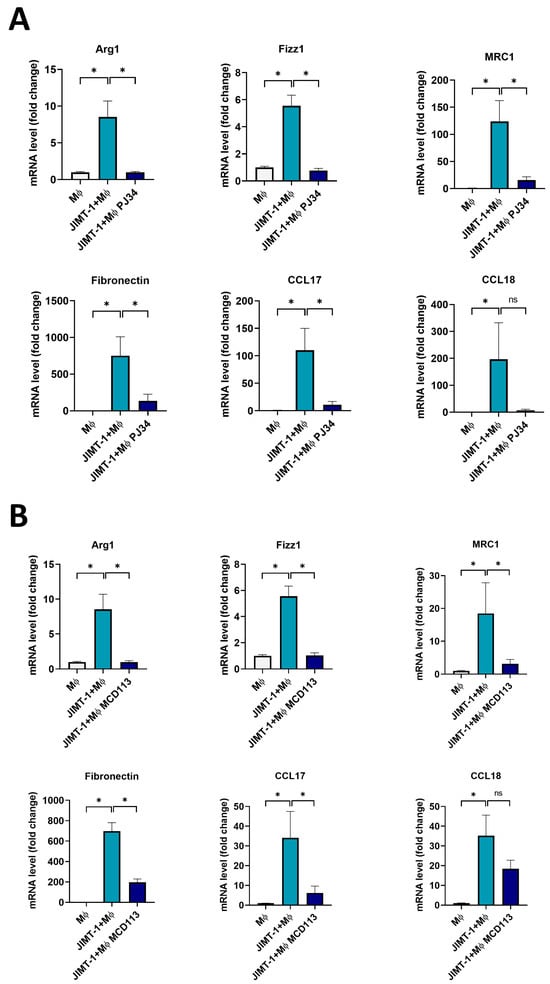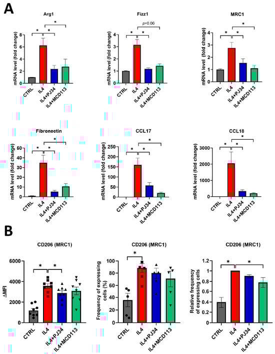 Furthermore, Arg1, MRC1, Fibronectin, CCL17, and CCL18 mRNA levels were found to be decreased after treatments with either PJ34 or MCD113. Both inhibitors decreased Fizz1 expression; however, the change was found to be significant only after pre-treatments with PJ34, while it did not reach the level of statistical significance (p = 0.06) in the case of MCD113 (Figure 3A).