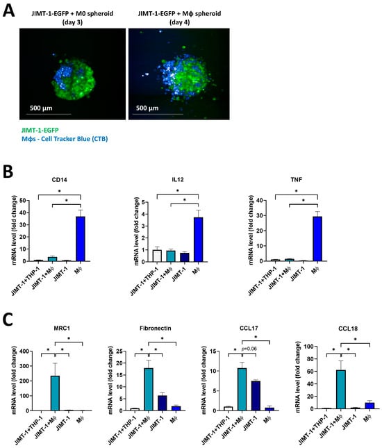 THP-1-derived macrophages incorporated into JIMT-1 breast cancer cell spheroids underwent M2-like polarization. Three-dimensional co-cultures (spheroids) were generated with JIMT-1-EGFP and THP-1-differentiated macrophages (MΦs, differentiated from THP-1 cells with 100 ng/mL PMA for 48 h). JIMT-1-EGFP cells (green) and MΦs (stained with 10 µM Cell Tracker Blue (CTB)) were mixed at a 1:1 ratio. Images were taken on day 3 after the induction of the formation of spheroids (JIMT-1+M0, left) and on day 4 after 20 ng/mL IFN-γ treatments (JIMT-1+MΦ, right) (A). mRNA levels of M1 (B) and M2 markers (C) in spheroids were determined by RT-qPCR. Spheroid co-cultures were kept in cultures for a total time of 4 days (1 day in the presence of IFN-γ). Columns show the relative expression of mRNA levels of the polarization markers in spheroid co-cultures JIMT-1+THP-1, JIMT-1+MΦ, and in JIMT-1 and MΦ spheroids, individually. The graphs show the mean of at least 3 independent experiments (±SEM). Statistical evaluation was performed with the Kruskal–Wallis test followed by Dunn’s post-hoc test, or with one-way ANOVA and Tukey’s post-hoc test (CD14 in (B) and Fibronectin in (C)) (* p < 0.05).