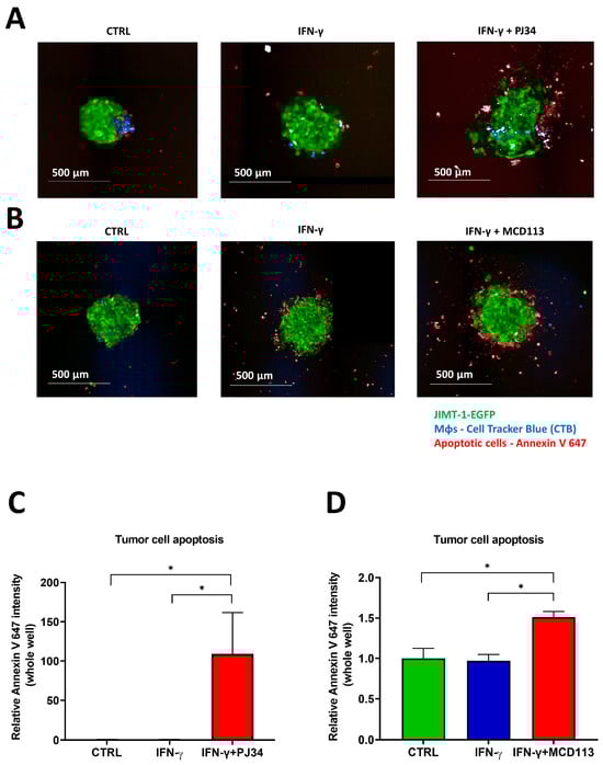 The PARP inhibitors PJ34 and MCD113 induced apoptotic tumor cell death in spheroid co-cultures. Co-culture spheroids were generated with JIMT-1-EGFP (green) and Cell Tracker Blue-stained derived MΦs at a 1:1 ratio. Spheroids were kept in cultures for a duration of 4 days (1 day in the presence of 20 ng/mL IFN-γ) and were then treated with 25 μM PJ34 or 55 μM MCD113 for 24 h. Cells were stained with Annexin V 647 to detect apoptosis. Images were taken after spheroid formation on day 5 following PJ34 and MCD113 treatments ((A,B) respectively). Images of 3 spheroids/treatment were taken and analyzed for the fluorescence intensity of Annexin V-Alexa 647 in tumor cells/each well (C,D). Means ± SEM of 3 independent experiments are shown. The statistics were calculated with one-way ANOVA followed by Dunnett’s post-hoc test (* p < 0.05).