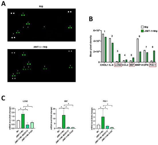 Proteome profiling suggesting the involvement of LCN2, MIF, and PAI-1 in TAM polarization. Spheroids were generated either from THP-1-derived MΦs or JIMT-1-THP-1-MΦ co-cultures. Cells were kept in cultures for 4 days (1 day in the presence of 20 ng/mL IFN-γ), and supernatant was collected. Cell supernatants (500 μL) were added to each membrane array (A), and analytes were detected by proteome profiling as described in Section 4 (B). Using the same conditions, RNA was also extracted from spheroids, and mRNA levels of the same set of cytokines were quantified by RT-qPCR. Treatments with the PARPi PJ34 (25 μM) and PARP14i MCD113 (55 μM) resulted in a significant decrease in the expression of these cytokines (C). The numbers in (A,B) indicate the different cytokines detected. Red rectangles in (B) depict the three cytokines selected for quantitation by RT-qPCR, as shown in (C). Graphs show mean of at least 3 independent experiments (±SEM). Statistical evaluation was performed with one-way ANOVA and Tukey’s post-hoc test (* p < 0.05).