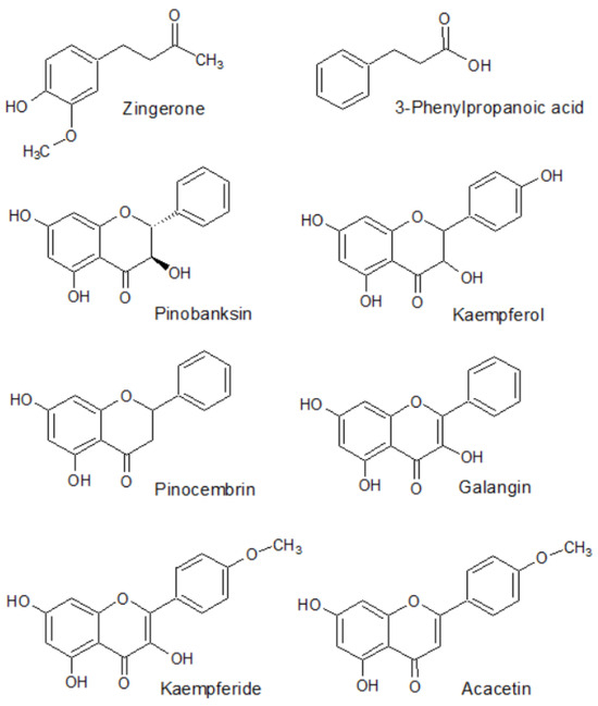 The main metabolites present in the mass chromatograms belonged to the group of flavonoids. Alpinia officinarum was proved to contain kaempferol and pinobanksin as the representatives of trihydroxyflavanones, a flavanone—pinocembrin, galangin and kaempferide—two flavonols, and acacetin from the group of flavones. The list is completed by two structures: zingerone, a derivative of vanillylacetone, and 3-phenylpropanoic acid. Previously, the compounds were identified in the same plant genus by other authors and were perceived as the molecules responsible for the pharmacological potential of the total extracts [67,68].