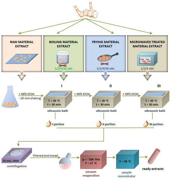 The material used in the research was the rhizome of Alpinia officinarum cultivated in Thailand, which was bought in a certified shop for natural products in Poland. Samples of plant raw material were subjected to three thermal treatment processes: boiling, frying and microwave exposure for various durations of time (1, 2, 4 and 10 min). Fresh plant raw material not subjected to any thermal treatment was used as a comparative material. Then, the extracts were obtained from all samples and used for further tests. A scheme illustrating all activities performed during the research is presented below (Figure 3).
