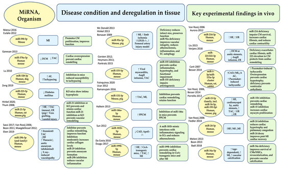 MiRNAs play a crucial role in the cardiovascular system. They are implicated in disease and disease phenotypes, and their effects can be engineered in vivo. The figure shows miRNA species and organisms under investigation (yellow), the disease state and regulation (blue), and key experimental evidence in vivo (green). Abbreviations: AF, atrial fibrillation; AngII, angiotensin II; CAD, coronary artery disease; CnA, human calcineurin subunit A; DCM, dilated cardiomyopathy; HF, heart failure; I/R, cardiac ischemia–reperfusion; CM, cardiac myocyte; EC, endothelial cell; KO, knockout; SMC, smooth muscle cell; MI; myocardial infarction; PPCM, peripartum cardiomyopathy; AAC/TAC, ascending/transverse aortic constriction. From Nappi et al. ref [12]; Refs. [11,12,13,14,15,16,17,18,19,20,21,22,23,24,25,26,27,28,29,30,31,32,33,34,35,36,37,38,39,40,41,42,43,44,45,46,47,48,49] in the figure. Up arrow = increase, Down arrow = decrease.
