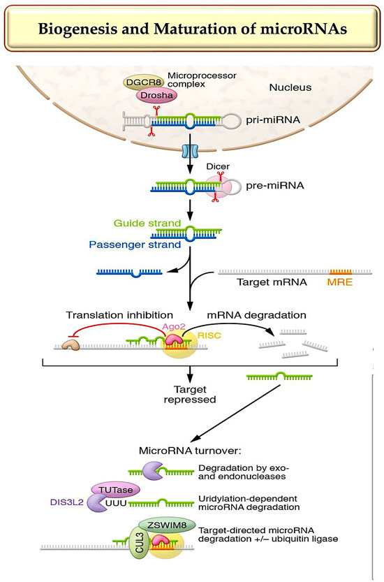 Transcripts that regulate gene expression and protein function are called non-coding RNAs (ncRNAs). They are generated from the non-protein-coding part of the genome. The two major classes of ncRNA are miRNAs and long ncRNAs (lncRNAs). Excellent reviews have addressed the biogenesis and maturation of microRNAs, as depicted in Figure 2 [50,51,52].