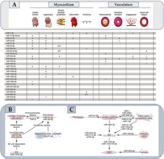 (A) summarizes the role of miRNAs in heart muscle and blood vessels. The miRNA that promotes a process is marked with a + sign, and the − sign denotes the miRNA that prevents a pathophysiological process. The microRNAs that either promote or inhibit cardiac function when their levels are elevated or inhibited are described in the respective sections. (B) describes microRNAs that regulate the targets responsible for intercellular communication in the cardiovascular system. (C) explains the paracrine roles of specific miRNAs secreted within the cardiovascular system. In contrast, the miR-21 core fragment released by endometrial mesenchymal stem cells has cardioprotective effects by promoting cell survival and angiogenesis. Similarly, miRNAs from the myocardium promote the mobilization of progenitor cells in the bone marrow. Platelets carry miR-223-3p, which regulates the differentiation and proliferation of vascular SMCs. Refer to Ref. [50] for a survey of different cardiovascular microRNAs with suggested paracrine activity. Abbreviations: EC, endothelial cell; miRNA, microRNA; SMC, smooth muscle cell. From Laggerbauer B et al. [12,13,14,15,16,17,18,19,20,21,22,23,24,25,26,27,28,29,30,31,32,33,34,35,36,37,38,39,40,41,42,43,44,45,46,47,48,49,50,55,78,79,80,81,82,83,84].
