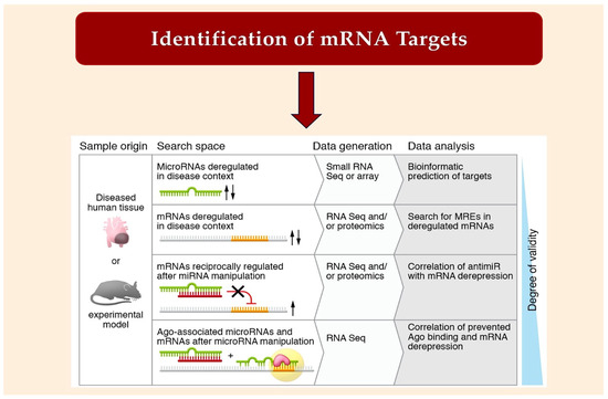 The diagram shows the various methods used to identify microRNA targets. The arrows indicate whether miRNA expression is increased or decreased in the animal model and diseased human tissue. From Laggerbauer B et al. Refs. [23,50,100,101,102,103,104].