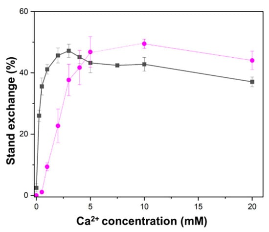 Differential Ca2+ concentration dependence between D-loop formation and oligonucleotide strand exchange. HsRad51-mediated D-loop formation (magenta) and strand exchange between two short oligonucleotides (black) were measured at various Ca2+ concentrations.