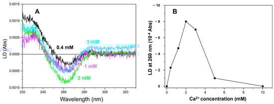 Next, we performed flow LD measurements of the HsRad51-ssDNA-ATP filament at different Ca2+ concentrations. In flow LD, a shear force was applied to align the sample molecules, and the difference in absorption between light polarized parallel and perpendicular to the sample orientation axis was measured []. Flow LD provides information about the chromophore orientation relative to the filament axis, and the signal intensity depends on the degree of filament orientation itself with respect to its stiffness []. Only non-moving chromophores in a stiff filament result in a significant LD signal [].