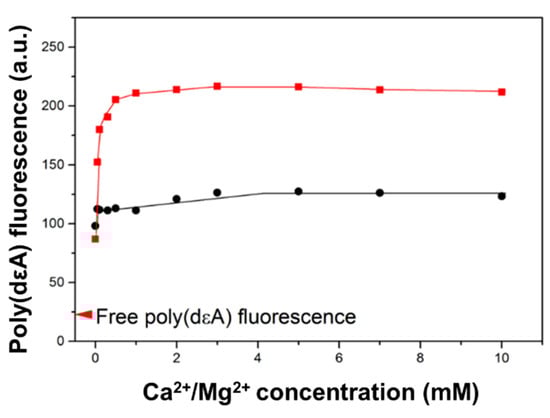 Effect of Ca2+ on poly(dεA) fluorescence intensity. Fluorescence intensity of poly(dεA) in HsRad51-ATP filament is shown at various Ca2+ (red symbols) and Mg2+ (black symbols) concentrations.