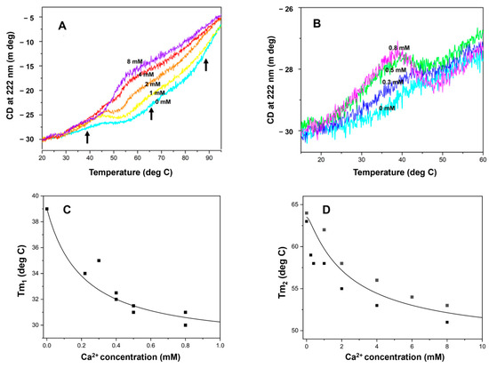 In this study, denaturation experiments were performed with no other elements (ATP, DNA) to observe the direct and selective effect of Ca2+ on HsRad51. Thermal denaturation was monitored by changes in the CD signal at 222 nm, which reflect the alpha-helix content []. HsRad51 exhibited a complex denaturation pattern with three apparent transitions: Tm1 = 38 °C, Tm2 = 65 °C, and Tm3 = 90 °C in the absence of Ca2+ (Figure 5A), which may correspond to the independent unfolding of three domains in HsRad51. According to structural analyses of Rad51 by X-ray crystallographic analysis, HsRad51 comprises small N-terminal and C-terminal domains, as well as a large core domain [,].